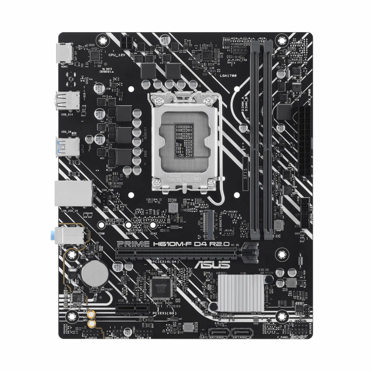 مادربرد ASUS PRIME H610M-F D4 دارای اسلات PCIe نسل 4.0 میباشد که میتواند کارت گرافیک های به روز را پشتیبانی کند. همچنین این مادربرد دارای خورجی تصویر HDMI و D-Sub و DVI-D port میباشد که میتواند از گرافیک داخلی پردازنده ها تا رزولوشن 4K پشتیبانی کند. این مادربرد دارای یک عدد اسلات M.2 2280 Gen 3.0 میباشد. که میتواند از اس اس دی های M.2 پشتیبانی کند. همچنین این مادربرد دارای 2 پورت SATA با سرعت 6Gb/s میباشد. تعدادپورت USB2.0 پنل پشت: 4 | هدرها: 1 میباشد. که شامل دو عدد پورت USB3.2 پنل پشت: 2xType-A | هدرها: 1xType-A میباشد.